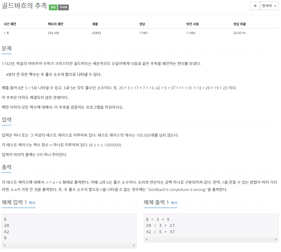 이 문제 역시 에라토스테네스의 체를 이용한다. 주어진 범위만큼 배열에 소수를 초기화 해놓고, 값을 입력 받아서 대칭이라는 점을 활용해 입력 받은 n/2 까지 for문을 돌려서 Array[i] 가 소수이고, Array[n-i] 가 소수 일때 출력하고 break문으로 빠져나온다. 그때 짝수를 두 홀수의 합으로 나타낼 수 없는지 체크하는 boolean 값을 설정해주고, 나타낼 수 없을때 출력해준다.