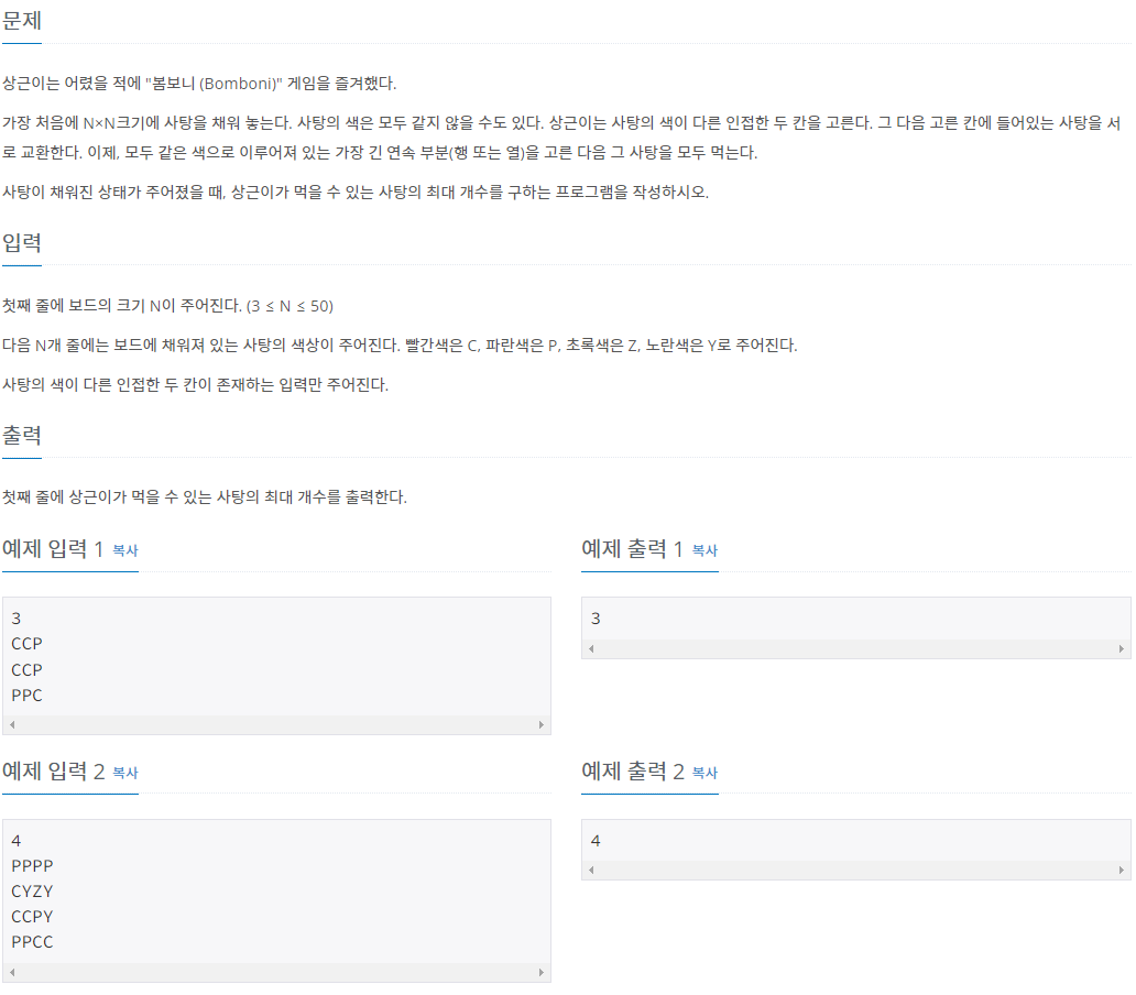 먼저 n*n의 사탕 게임의 가로와 세로를 각각 계산해 이어져 있는 가장 큰 수를 리턴하는 함수를 만들어 놓는다.