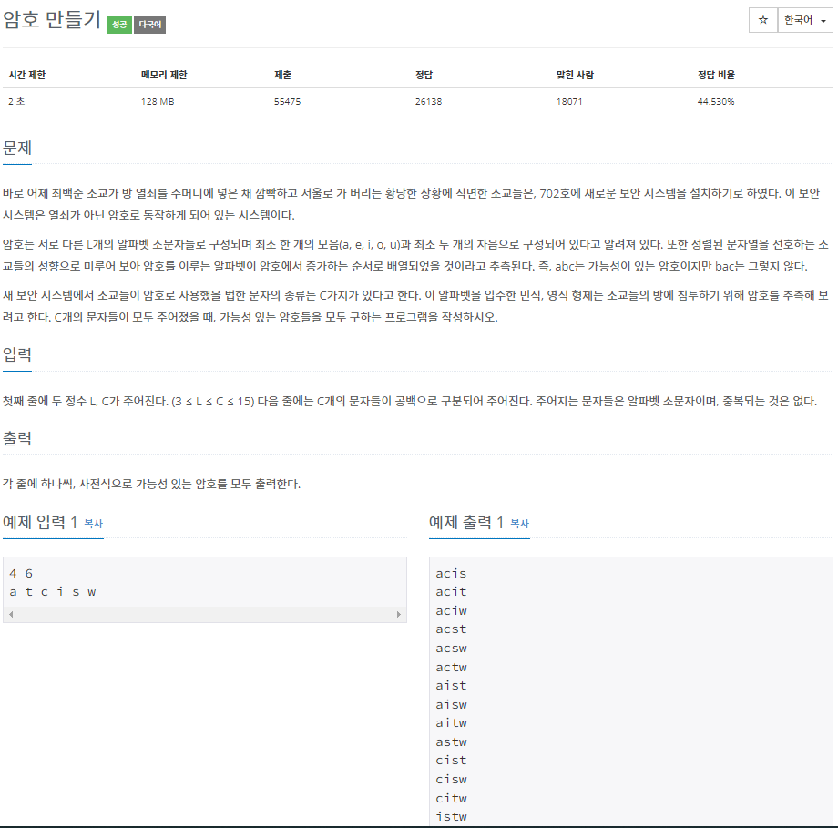 완성된 문자의 조합은 크기 순서대로 나열해야하고, 2번 인덱스의 문자는 1번 인덱스보다 커야 한다.