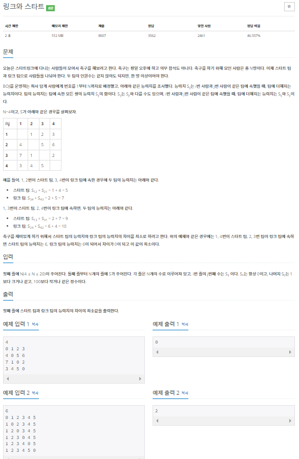스타트와 링크에서는 무조건 짝수의 팀이 주어졌지만, 이번 문제에서는 한명 이상 이기만 하면 된다.