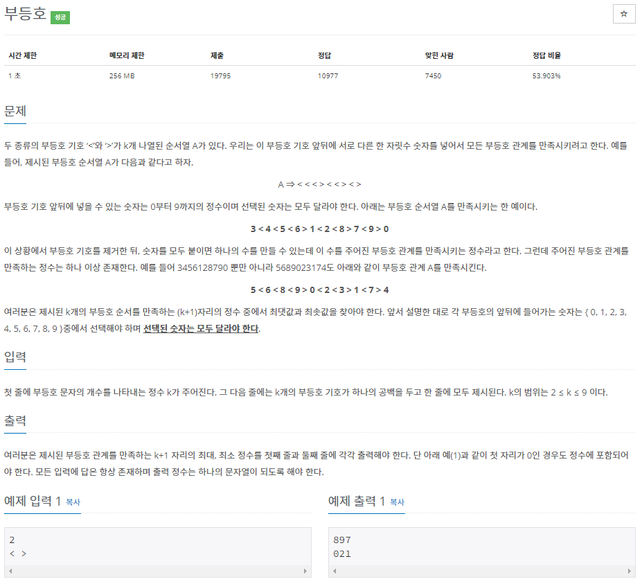 DFS와 백트래킹을 활용한다. 아스키코드로 부등호를 판별하고, 조건을 만족할 경우의 인덱스 i를 int 배열에 저장 하고Depth(N) 만큼 순회한다. Depth에 도달하게 되면 int 배열을 돌아 문자로 만들어주고, 문자를 정렬하여 최소값과 최대값을 출력한다.