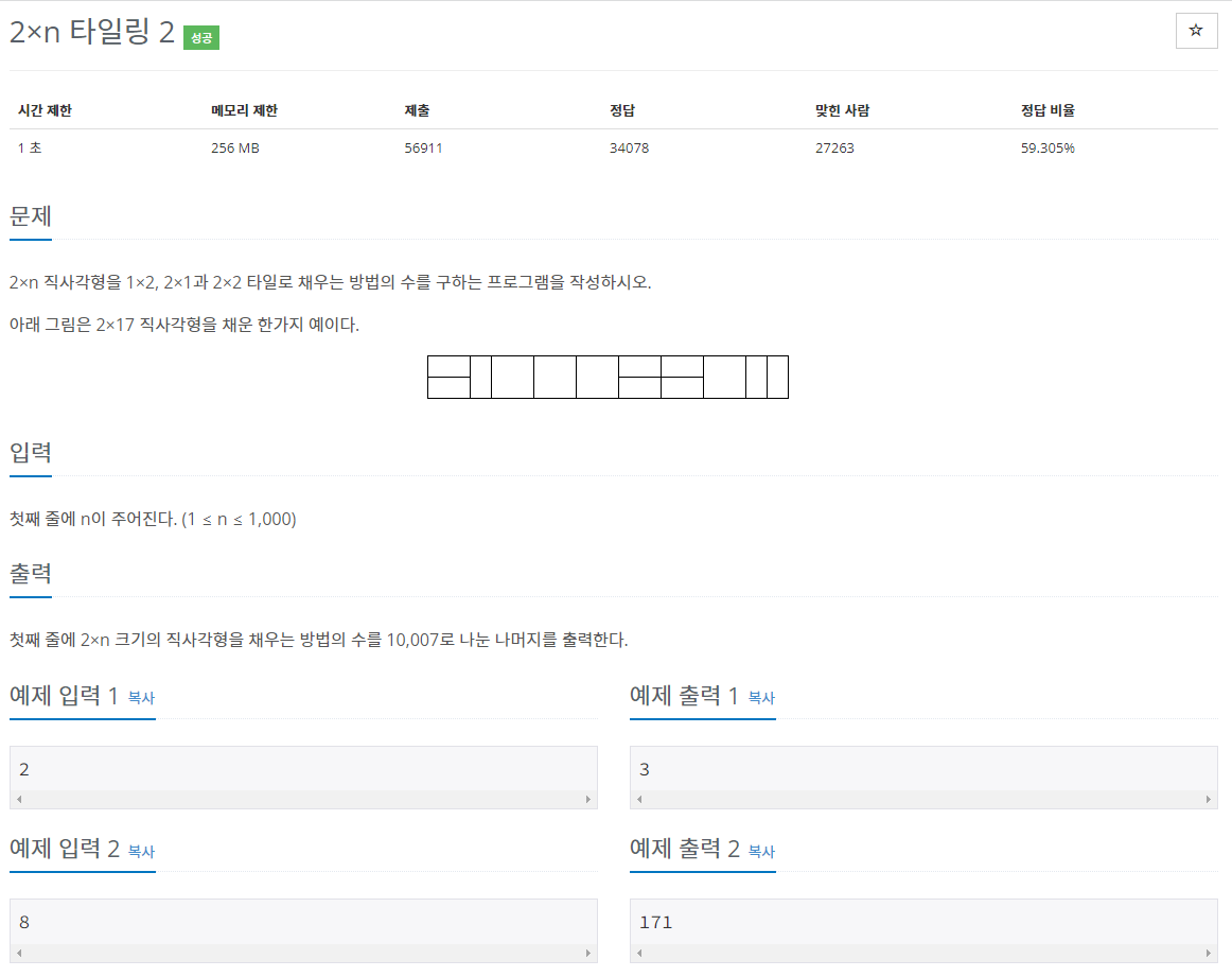 백준 11726번 2xn 타일링 (https://mokggang.tistory.com/42) 두 번째 문제다.