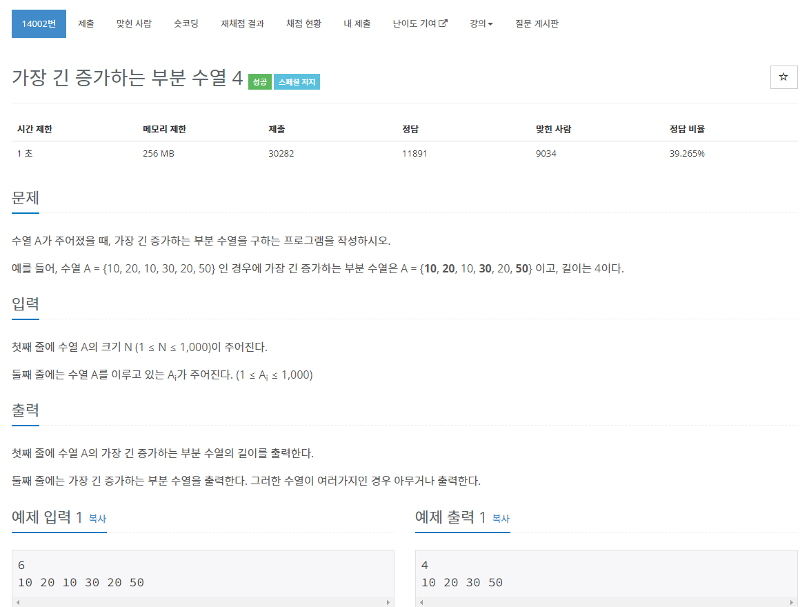 백준 11053번 : 가장 긴 증가하는 부분 수열(https://mokggang.tistory.com/47) 풀이에서