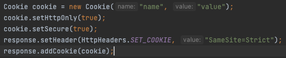 쿠키를 생성시 HttpOnly와 Secure 설정을 적용하고, Response 헤더 값에 SameSite 설정을 담아 응답한다.