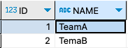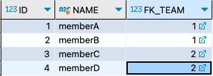 DB에는 4명의 멤버와 2개의 팀이 존재합니다.
