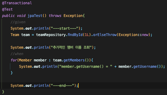 확인 해보면 조회한 팀에 해당하는 멤버를 조인해서 의도한대로 쿼리가 1개만 발생하는 것을 확인할 수 있습니다. 이 결과는 JPA의 도움으로 단일 객체 조회(findById, find)에서는 팀과 멤버를 조인한 결과를 반환해주기 때문입니다. 하지만 서비스 로직을 개발하다보면 다수의 팀 데이터를 조회하고 싶은 경우가 생깁니다. 모든 팀을 조회 후 이름을 출력 해보겠습니다.