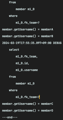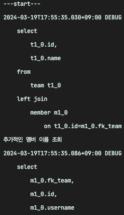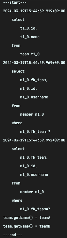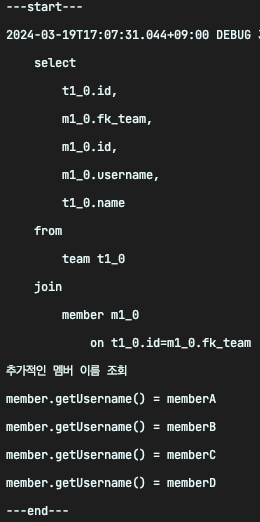 팀과 멤버가 조인된 형태로 쿼리가 한 번만 발생하고, 지연로딩 설정된 멤버 목록에 접근하더라도 쿼리가 추가적으로 발생하지 않았습니다.