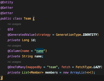 항상 단골로 등장하는 엔티티. '멤버' 와 '팀' 의 관계를 예시로 설명 드리겠습니다.