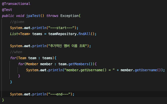 Fetch Join 을 사용해 팀 목록을 조회하고, 지연로딩 되어 있는 멤버 데이터에 접근해서 멤버이름을 출력 해보겠습니다.